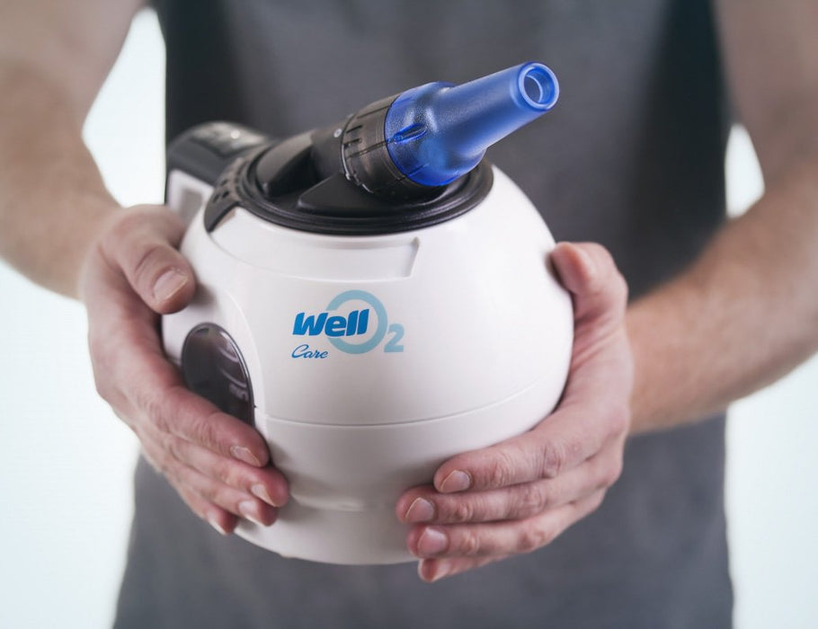 WellO2 er et værktøj, der styrker, udvider og renser luftvejene gennem åndedrætsmodstand og varm damp.
